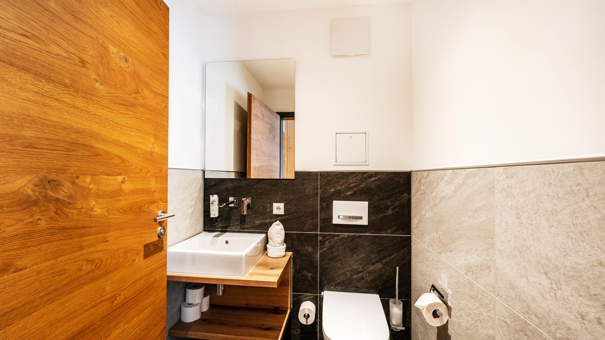 The light-flooded hallway with old wood panelling leads to the rustic bedroom with a comfortable box spring bed (180 x 200 cm), smart TV and bathroom. The bathroom with separate shower-WC, walk-in experience shower and a large washbasin is a real oasis of well-being. When the weather is fine, the large terrace with a comfortable seating invites you to relax.