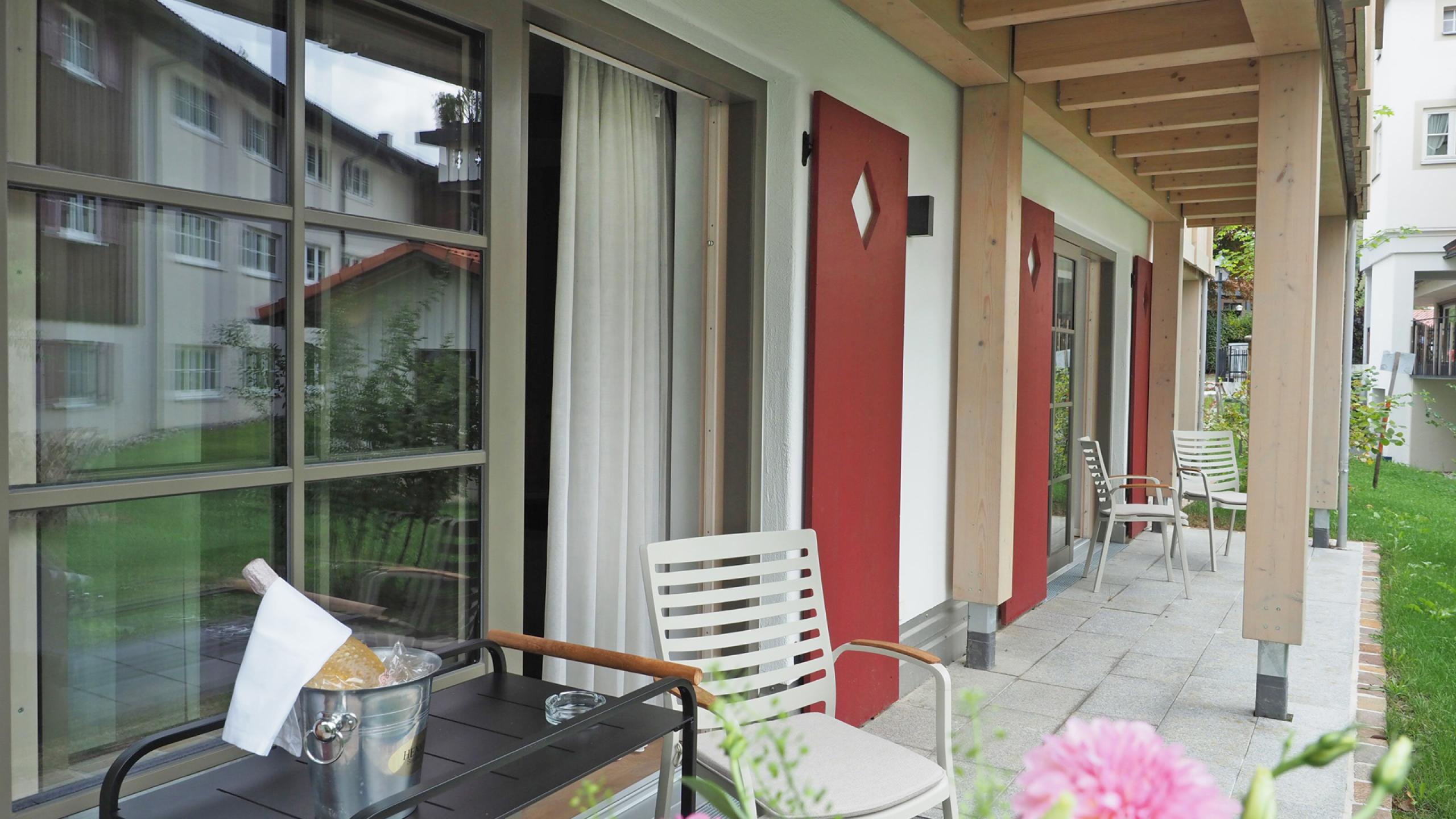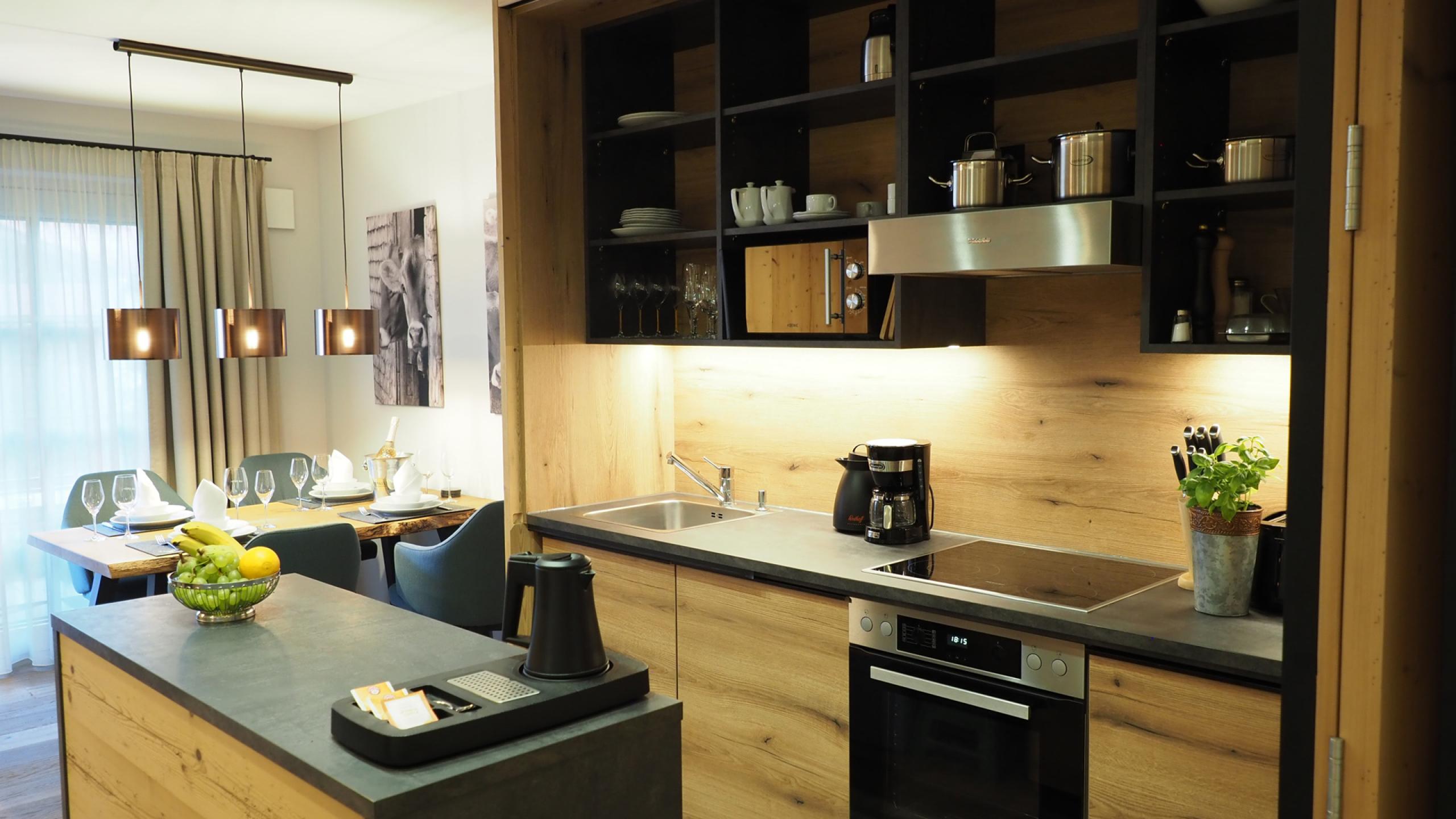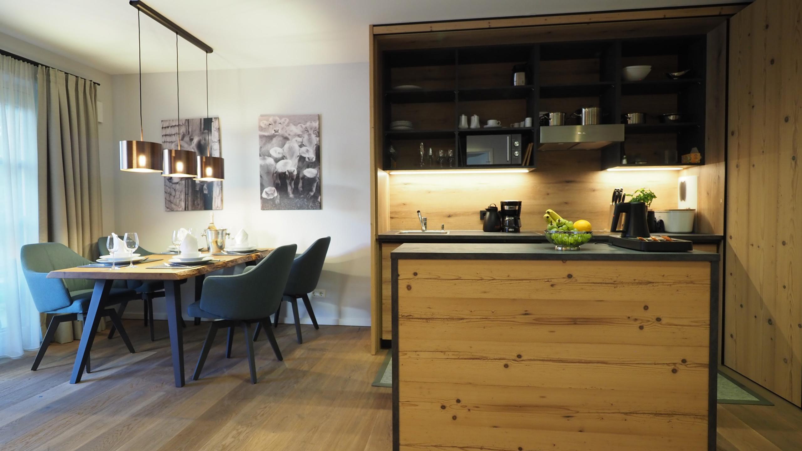 This ground floor apartment of 68 sqm is furnished in country house style. Wood planks and partly old wood panelling provide a cozy atmosphere. The sofa in the spacious living area is extendable, the kitchenette is fully equipped with ceramic hob, dishwasher, fridge with freezer compartment and microwave. From the bedroom with 2-m box spring bed you can access via a spacious dressing area directly into the bathroom with walk-in experience shower. The apartment has a spacious south-facing terrace.