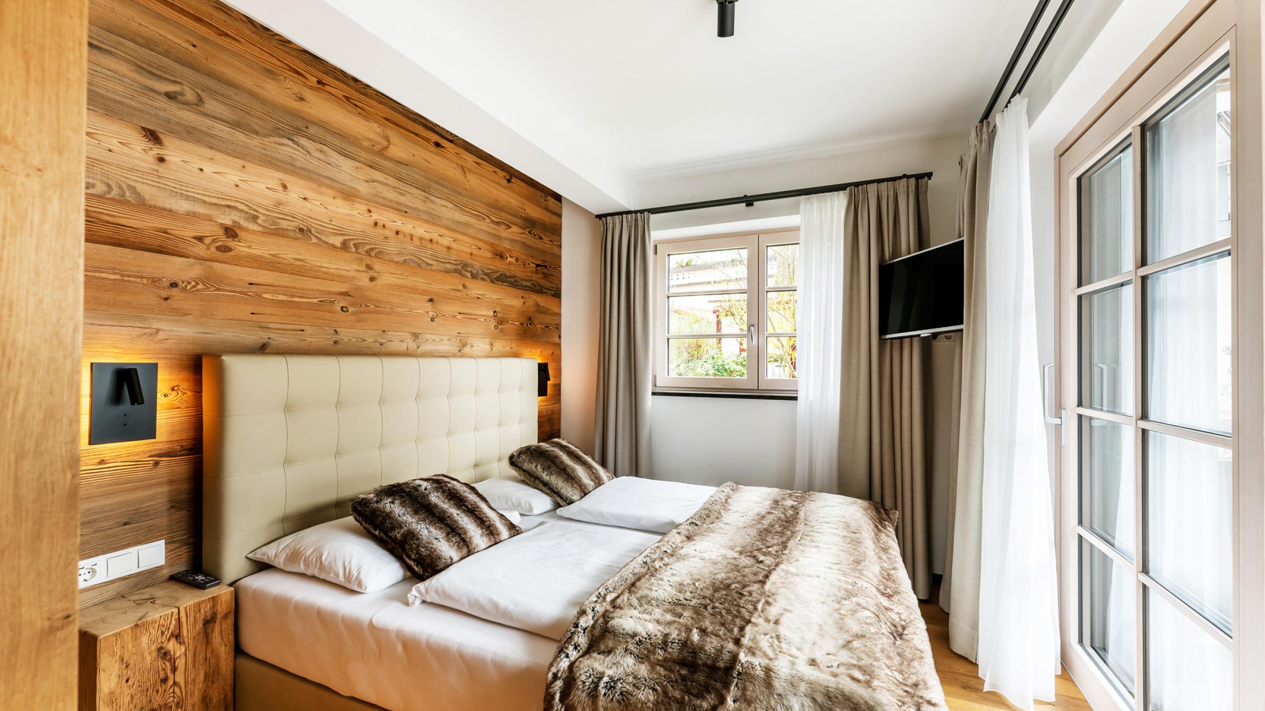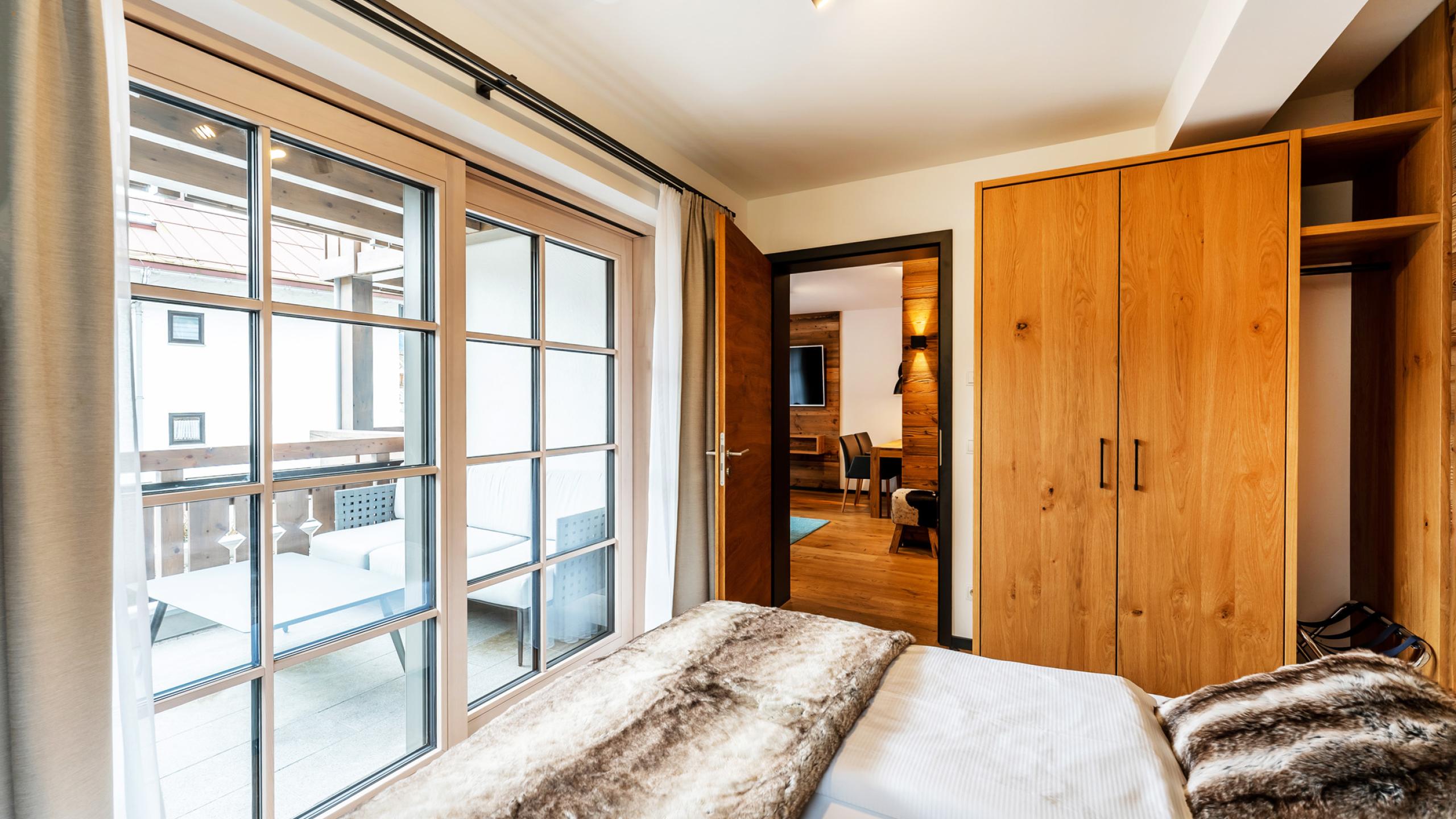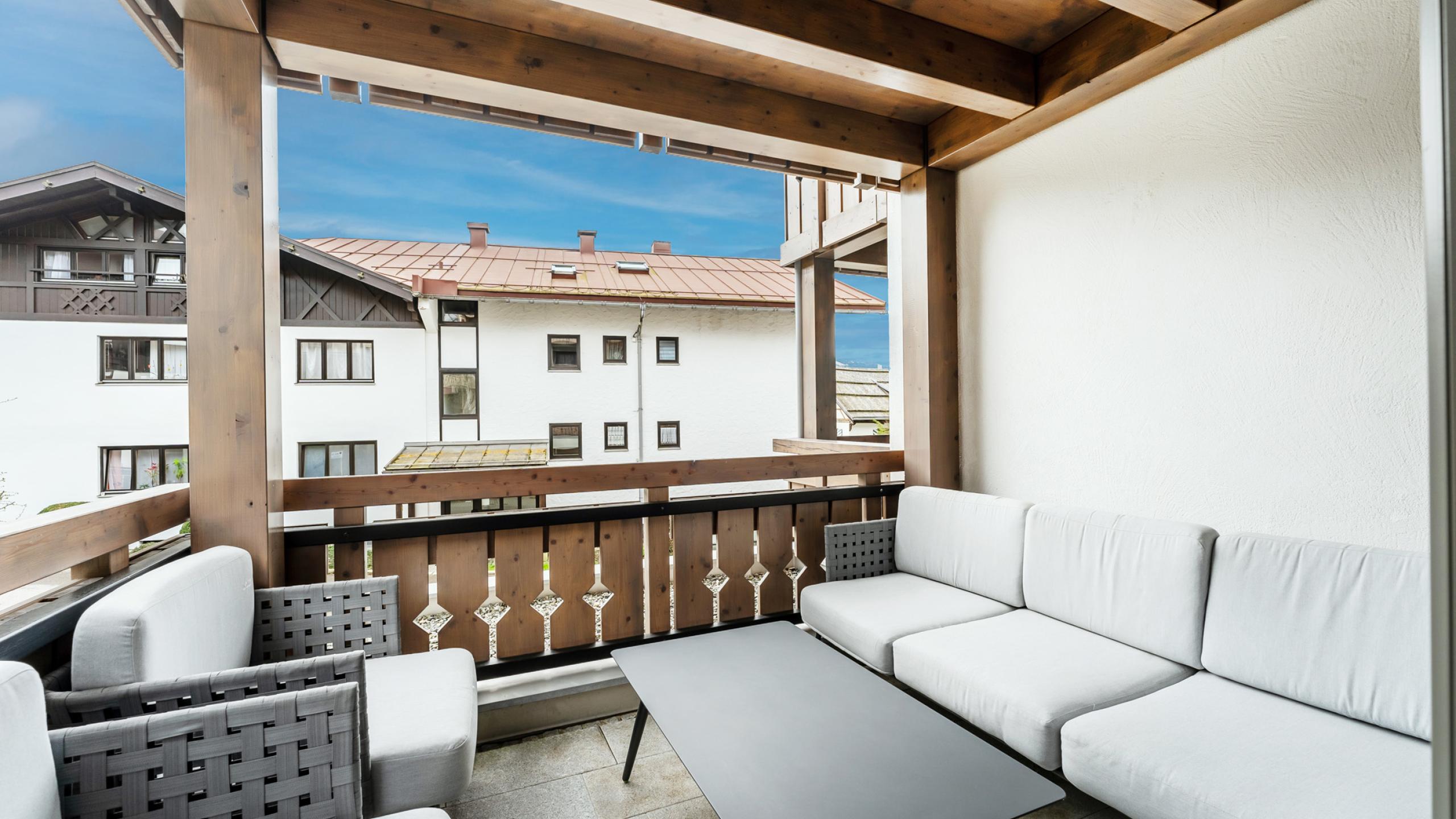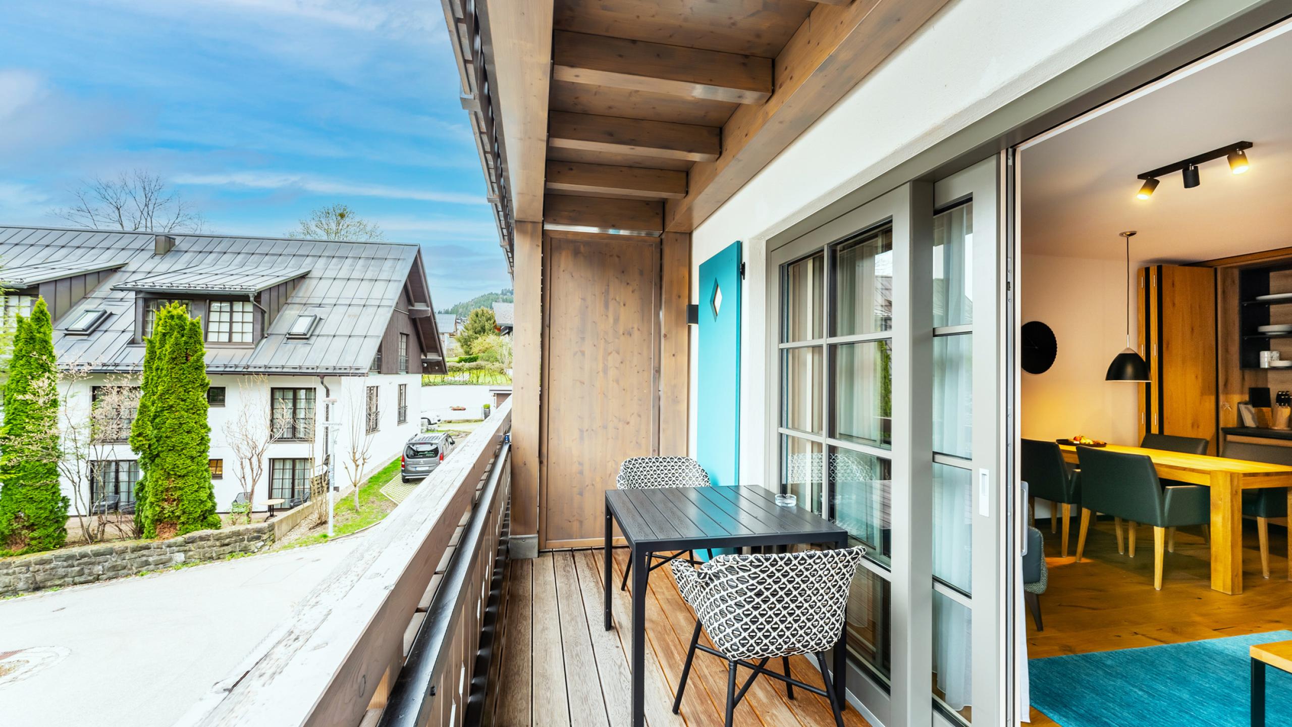 Through the light-flooded hallway with old wood panelling you enter the spacious living and dining area with fully equipped kitchen (minimum stay of 3 nights). On the sunny south-facing balcony you can relax and enjoy the partial mountain view. The bedroom has a box spring bed (180 x 200) with smart TV and a private, spacious south-facing balcony with a seating lounge.
