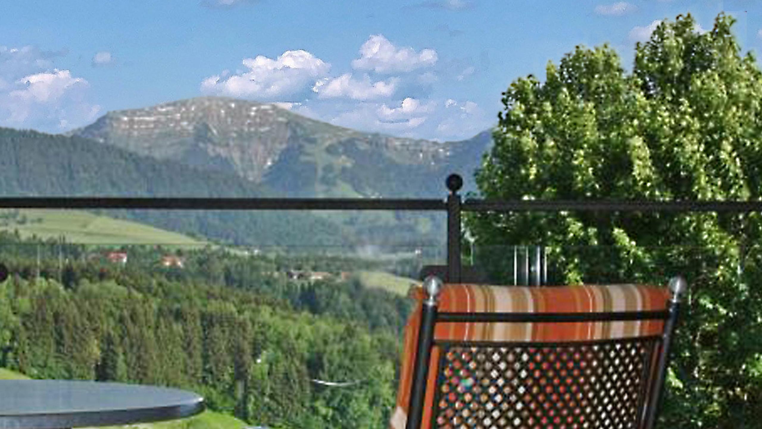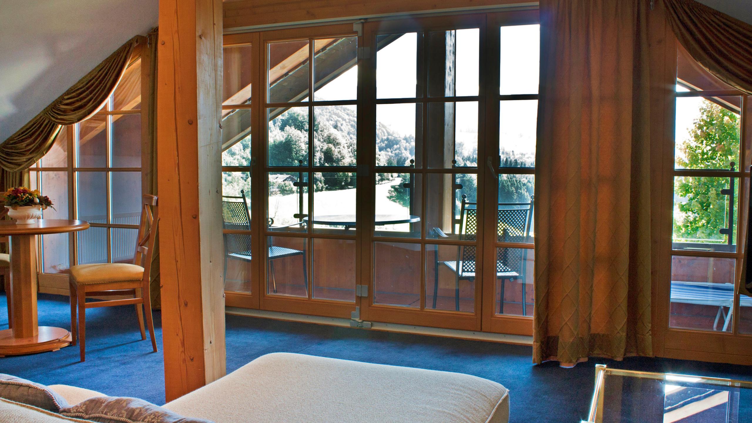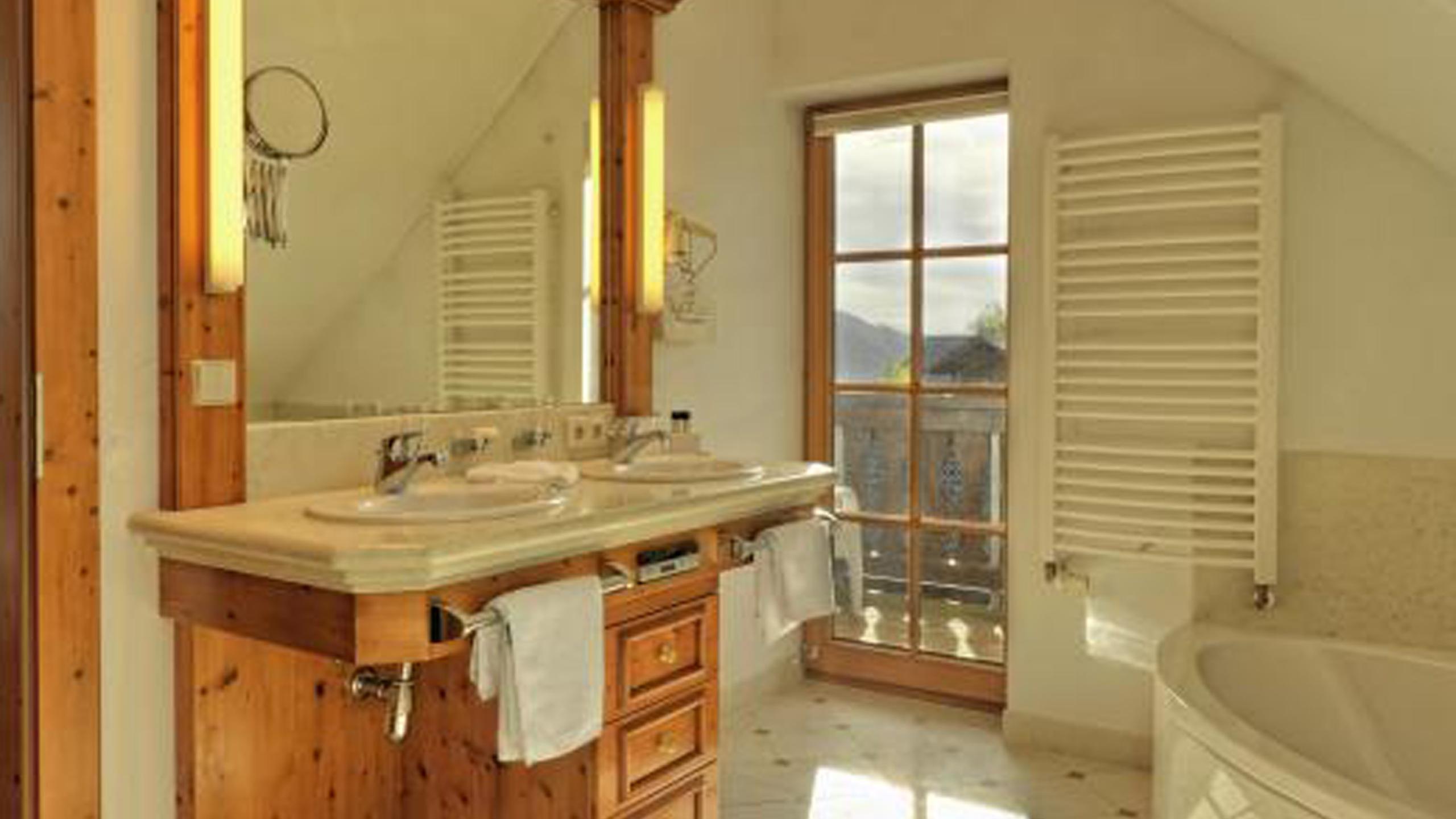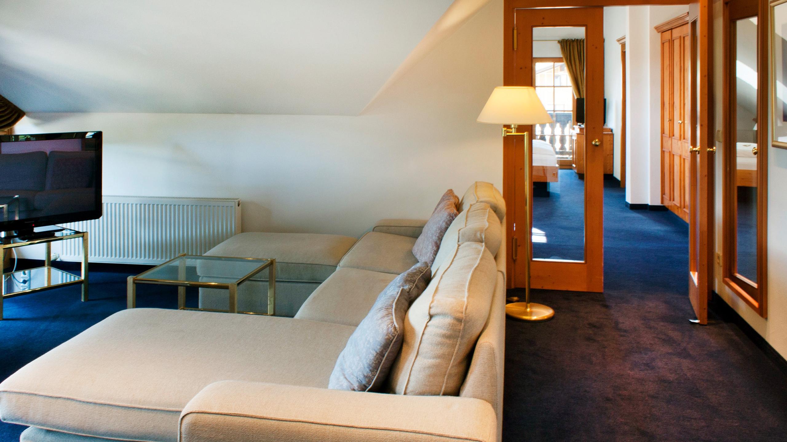 The King Ludwig suite is located on the top floor of the „Residenz“ building with a spacious living room and a large loggia with fantastic views of the iconic Hochgrat mountain. The bedroom features a balcony to the west. The suite has a large walk-in wardrobe as well as a small bedroom (size of the bed 0,90 m x 1,80 m). The spacious bathroom includes a large bathtub and a seperate shower. The King Ludwig suite can be occupied with 2 adults and 2 children.