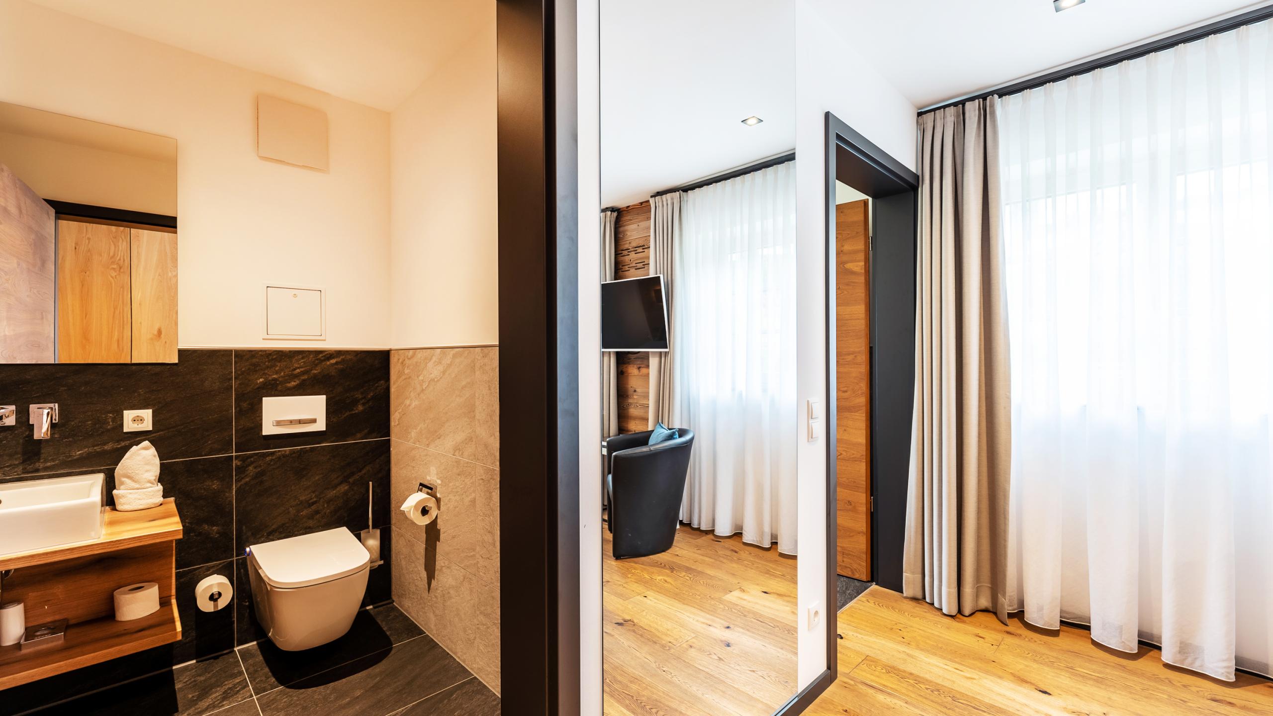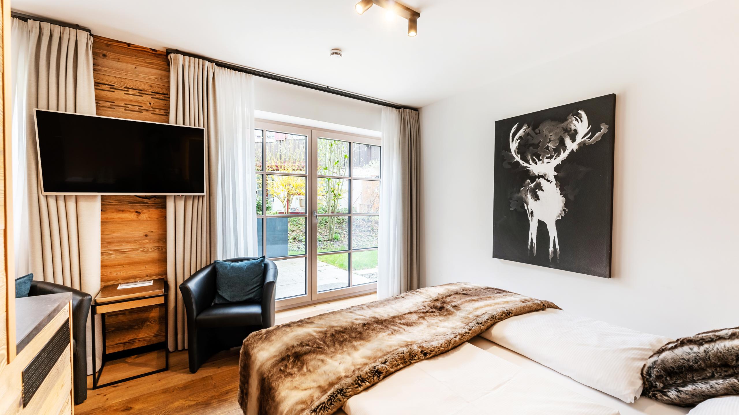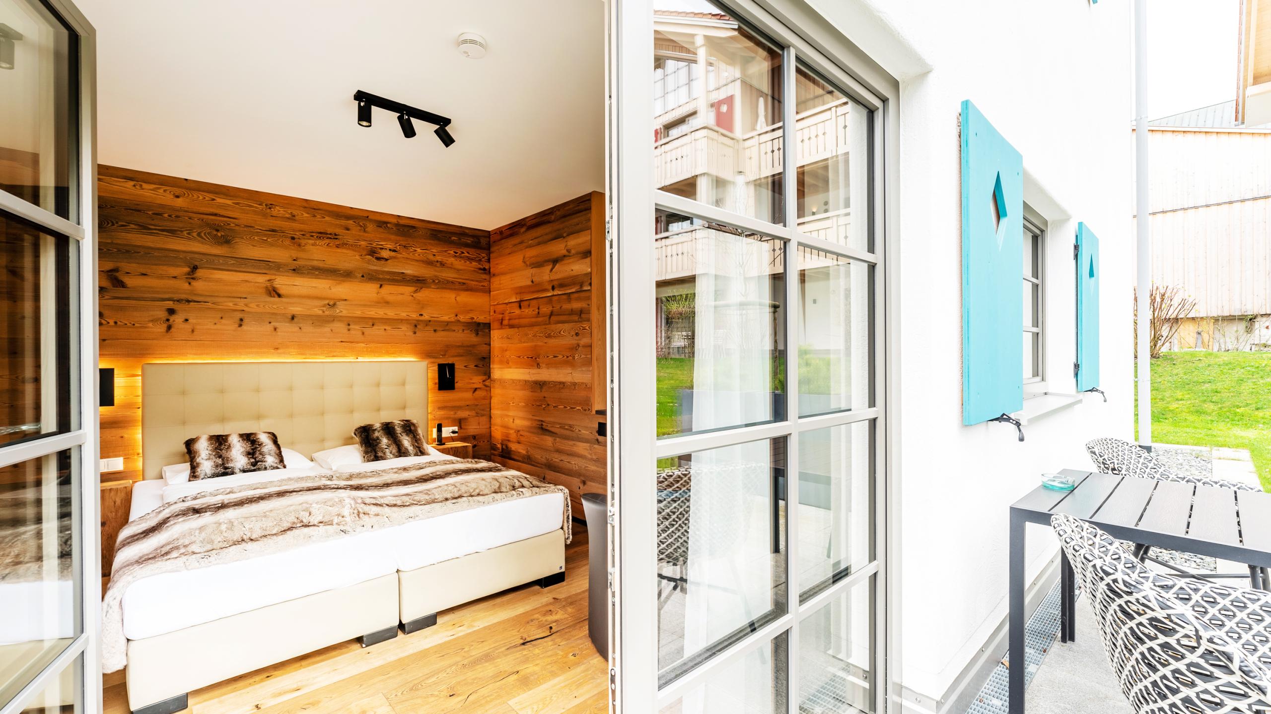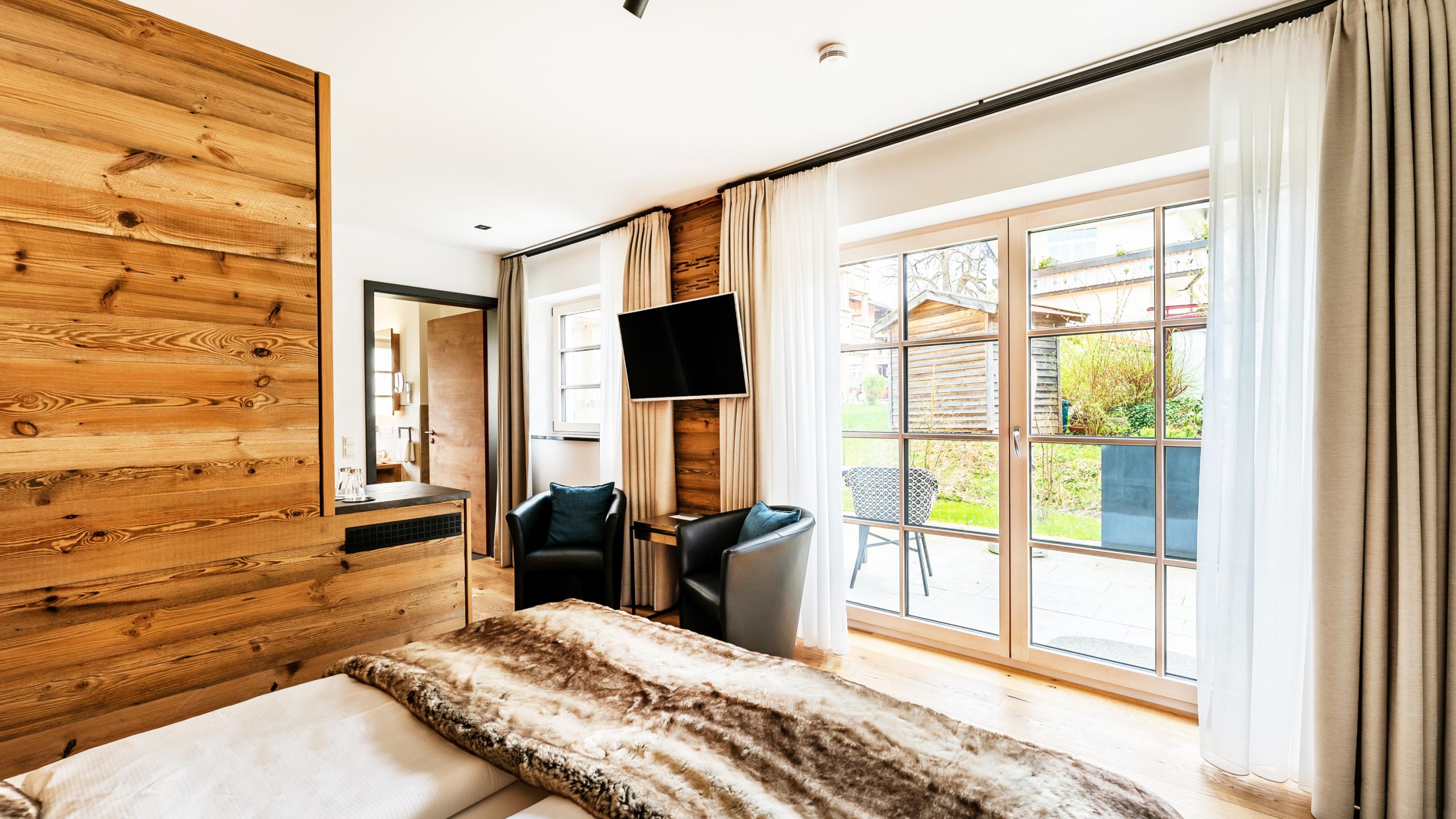Durch den lichtdurchfluteten Flur mit Altholz-Vertäfelung gelangen Sie in den urigen Schlafraum mit einem komfortablen Boxspringbett (180 x 200 cm), Smart-TV und Badezimmer. Das Badezimmer mit separatem Dusch-WC, begehbarer Erlebnisdusche und einem großen Waschtisch ist dabei eine echte Wohlfühloase. Bei schönem Wetter lädt die große Terrasse mit einer bequemen Sitzmöglichkeit zum Ausruhen ein.