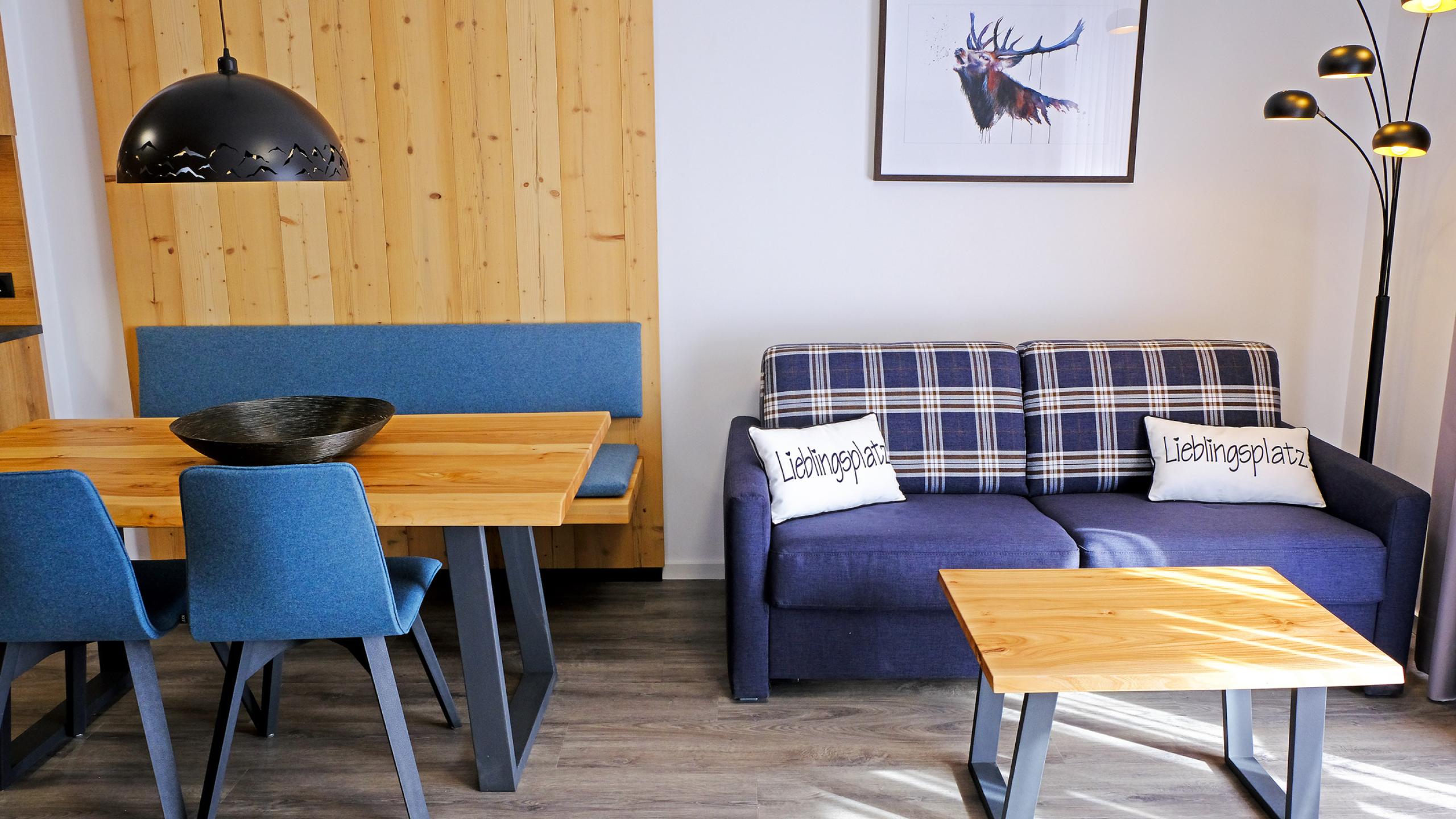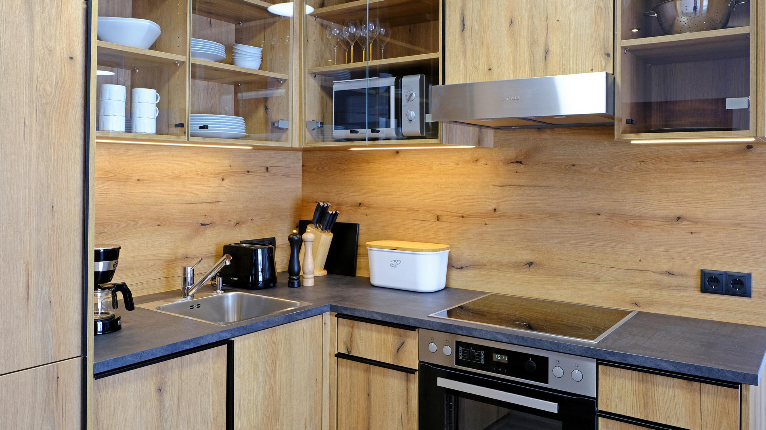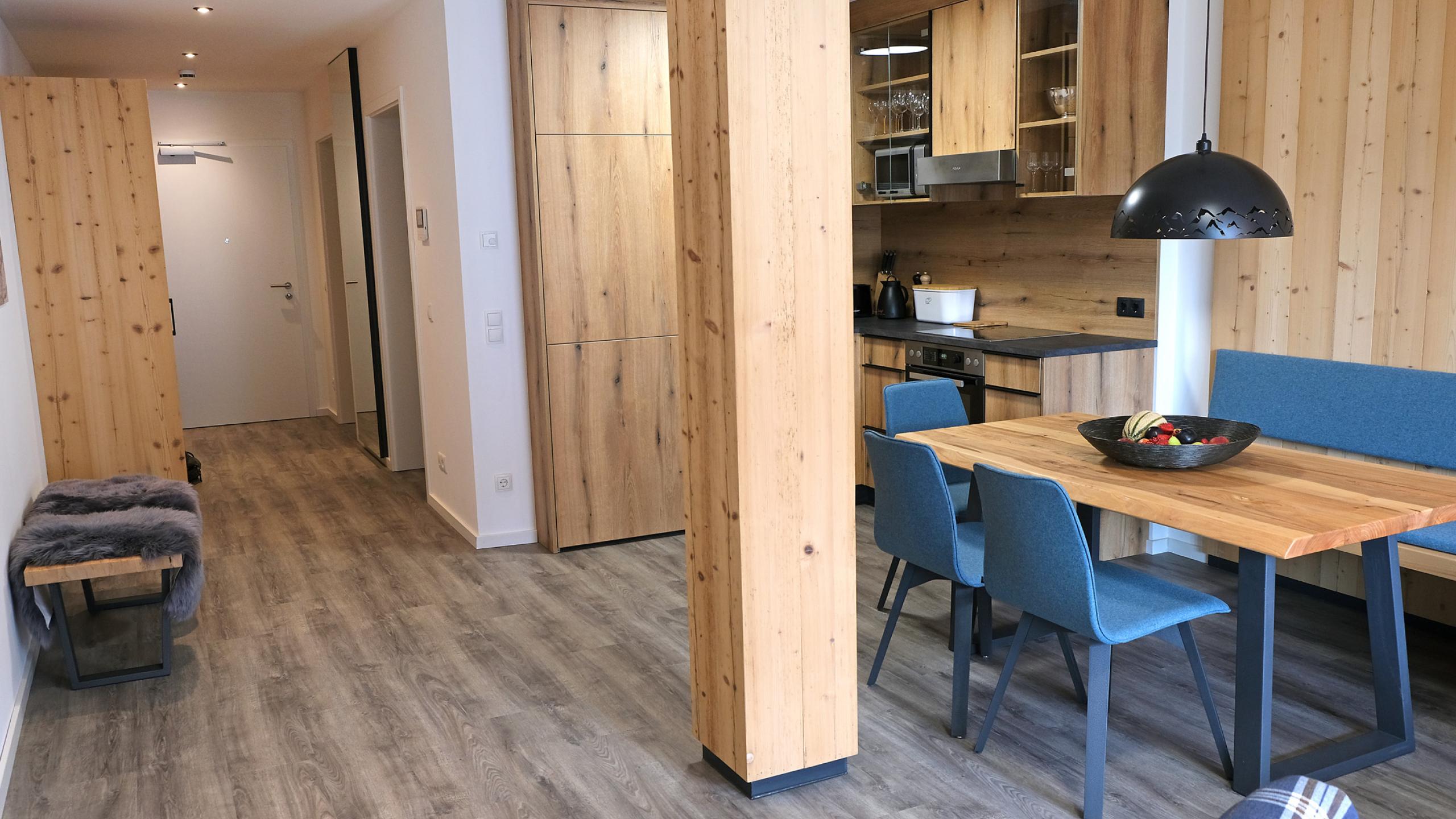 Ein weiterer Eingang führt zu dem großzügigen Wohn/Essbereich mit voll ausgestatteter Küche Cerankochfeld und Backofen, Mikrowelle, Geschirrspülmaschine, Kühlschrank, Toaster, Kaffeemachine, Wasserkocher, Waschtrockner, Essplatz und Sitzgarnitur/ Schlafsofa mit einer Liegefläche von 150x200cm und Zugang zu einem Südbalkon mit Gartenmöbeln.