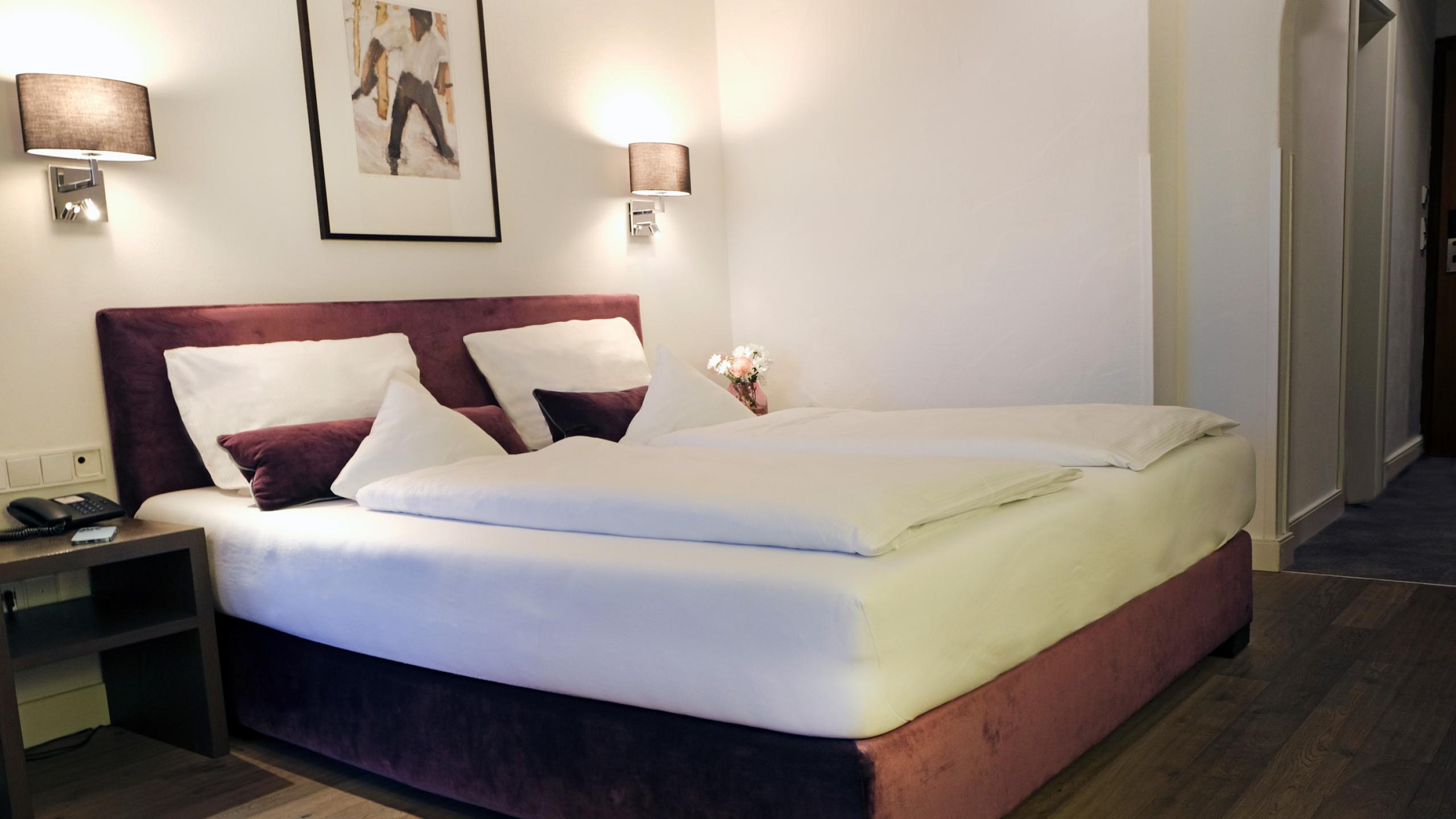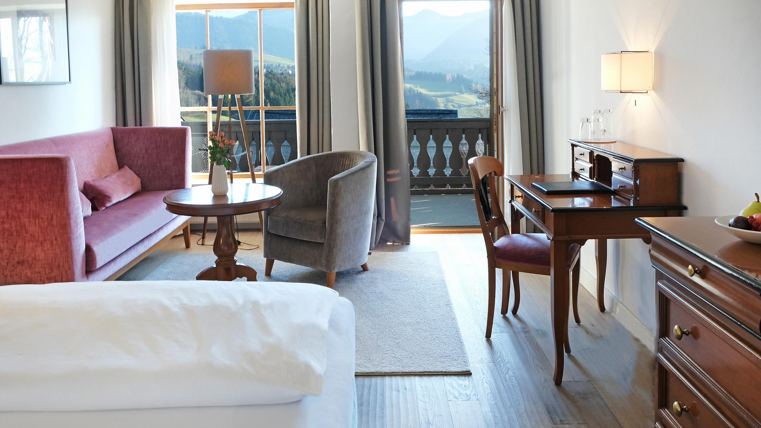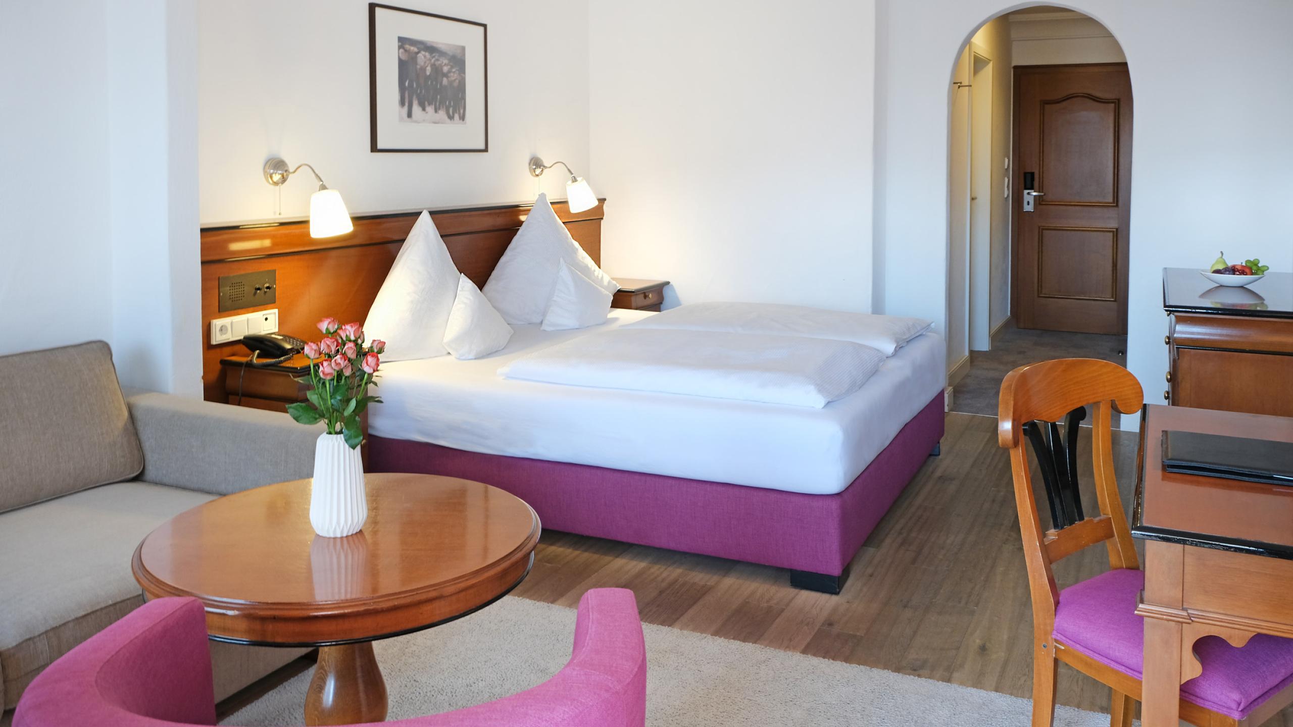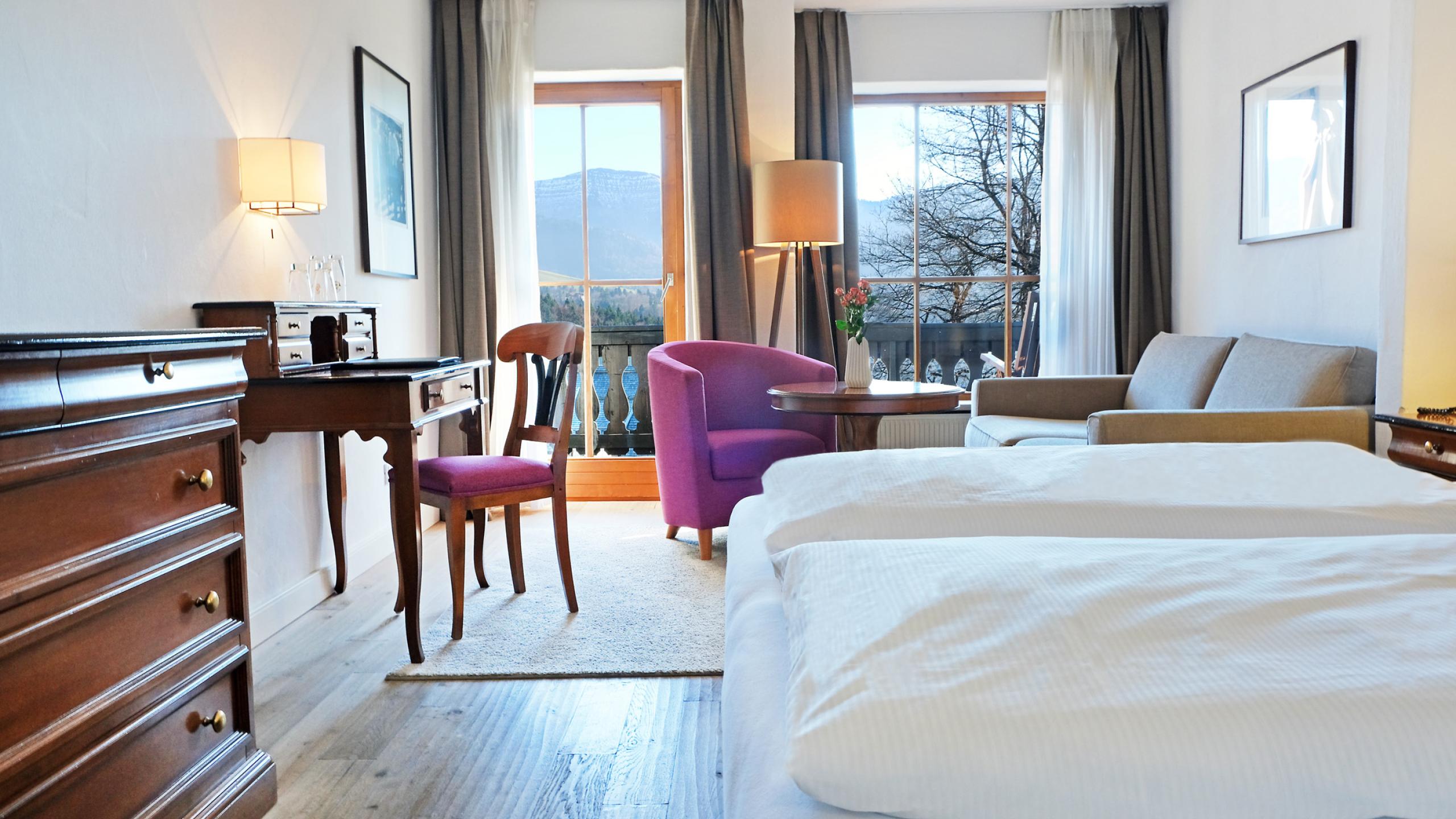 Unsere Deluxe Doppelzimmer mit Doppelbetten (1,80 x 2,00 m) liegen alle in unserer Residenz. Sie verfügen über einen Balkon mit traumhaftem Panoramablick und sind durch ihre Lage besonders ruhig. Im klassisch-modernen Stil eingerichtet, verfügen Sie über eine gemütliche Sitzecke, Schreibtisch und Parkettboden. Die neuen geräumigen Bäder sind mit einer ebenerdigen Dusche ausgestattet.